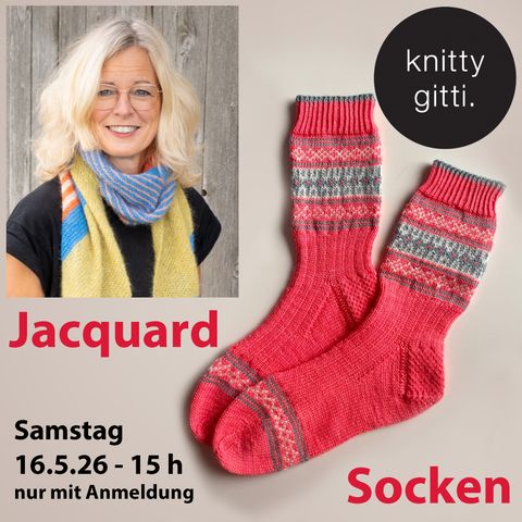 · Nach einer einheitlichen Anleitung, die Du im Kurs bekommst, stricken wir gemeinsam den Jacquardteil einer Socke.