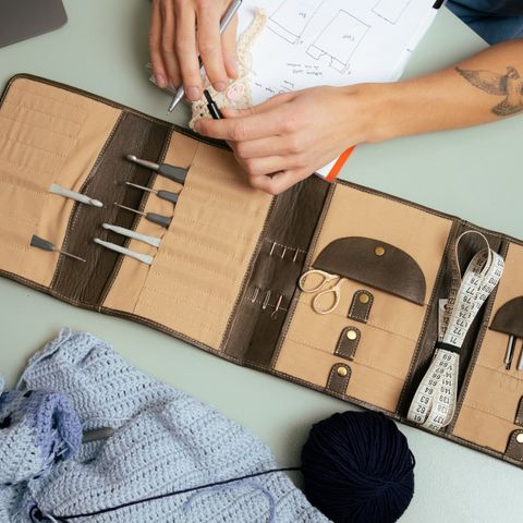 Project 14 ist wie ein aufklappbares Atelier für Deine Nadeln, Seile, Häkelnadeln, Wollnadeln, Schere und Maßband.